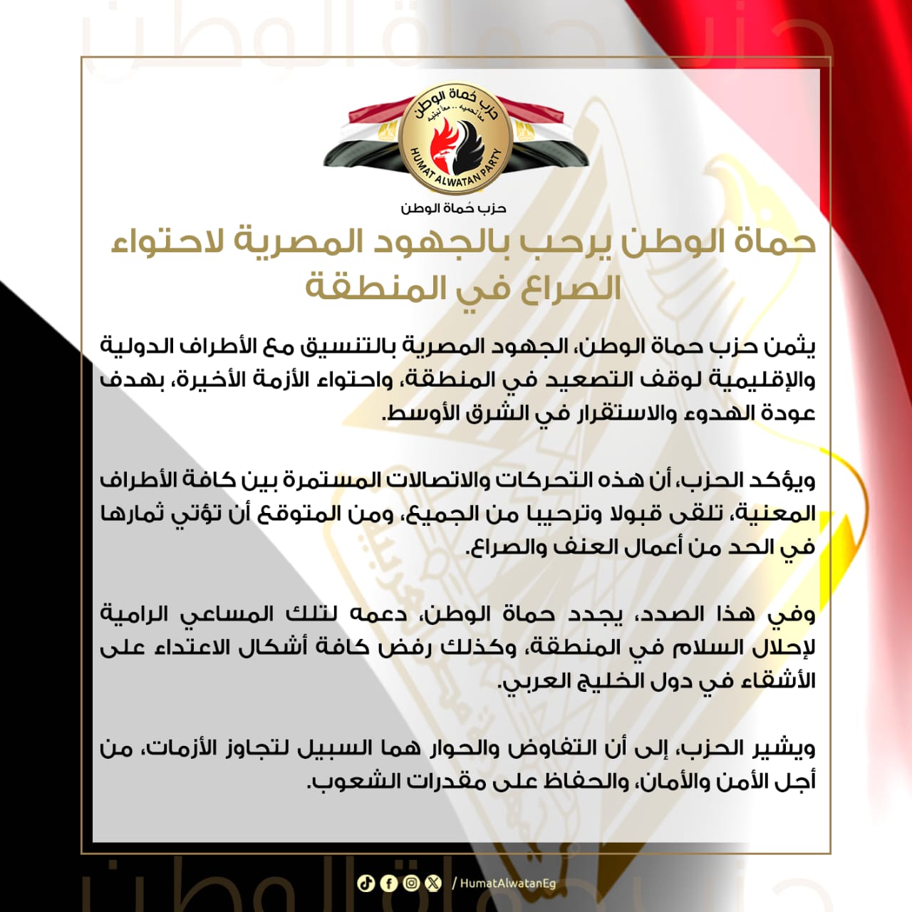 حماة الوطن يرحب بالجهود المصرية لاحتواء الصراع في المنطقة