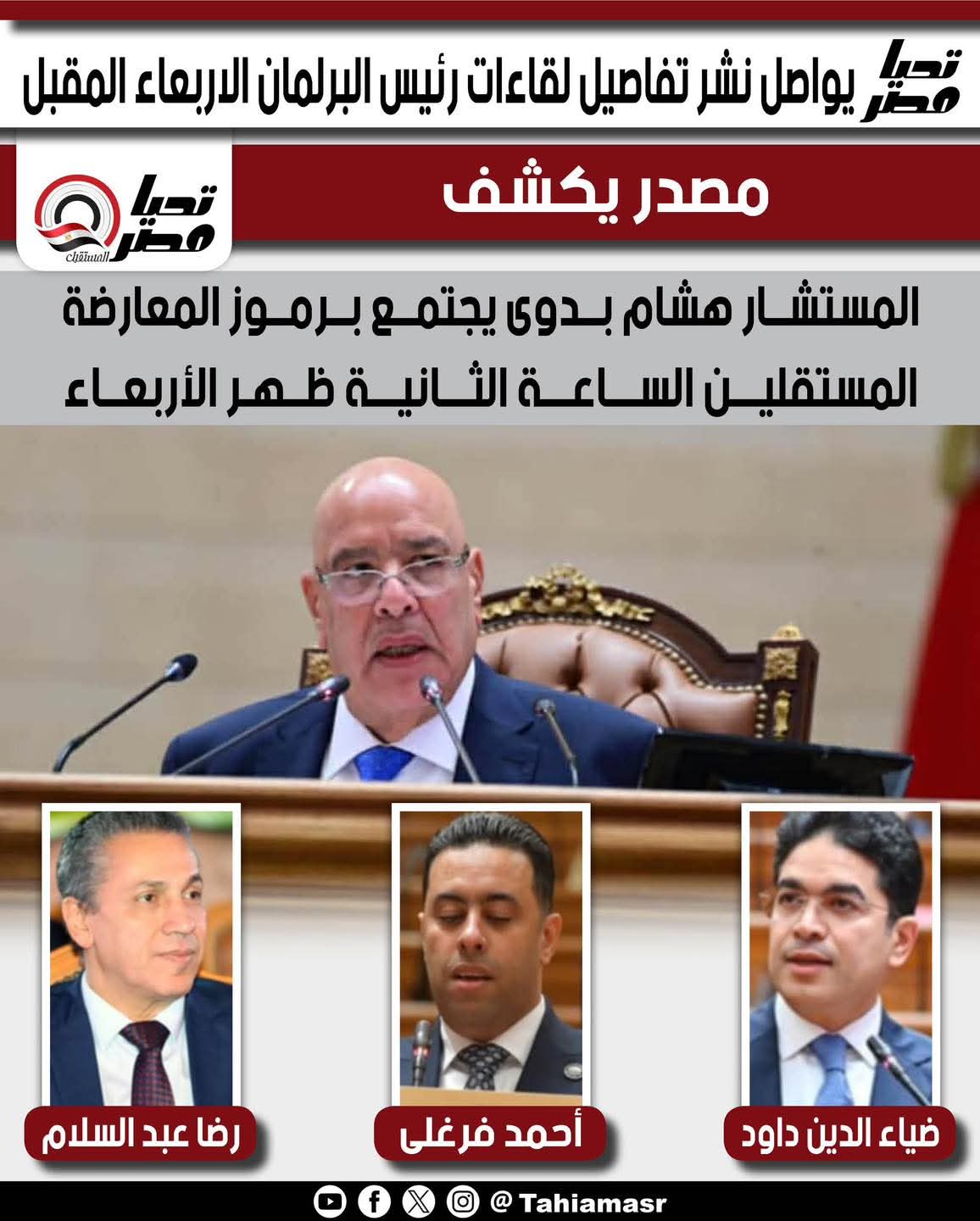 كشف مصدر برلماني، أن رئيس مجلس النواب سيعقد اجتماعًا مع عدد من رموز المعارضة في تمام الساعة الثانية ظهر غدا الأربعاء، من بينهم النائب ضياء الدين داود، والنائب أحمد فرغلي، والدكتور رضا عبد السلام، وذلك في خطوة تعكس توجهًا نحو توسيع دائرة الحوار داخل المجلس.