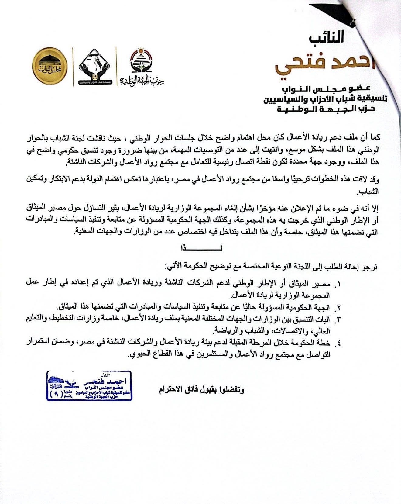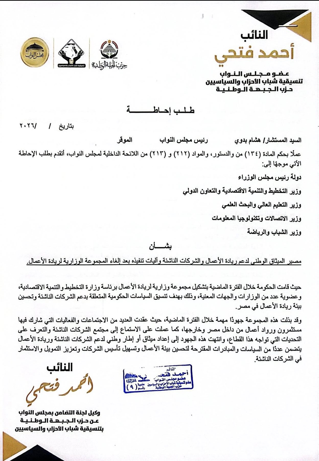 النائب أحمد فتحي يتقدم بطلب إحاطة بشأن مصير ميثاق ريادة الأعمال بعد إلغاء المجموعة الوزارية