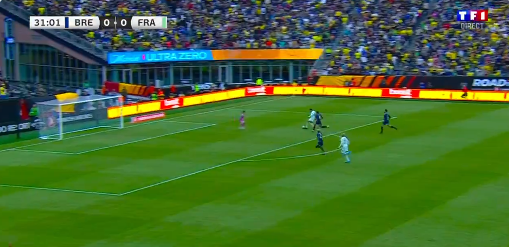 وجاء الهدف بعد مرور دقائق شهدت سيطرة فرنسية كبيرة على مجريات اللعب، حيث وصلت نسبة استحواذ منتخب فرنسا إلى 74% مقابل 26% للمنتخب البرازيلي، مع هجمات متكررة من الجانب الفرنسي وإغلاق دفاعي محكم من البرازيل، التي حاولت الاعتماد على المرتدات السريعة لإحداث خطورة على مرمى الحارس الفرنسي.