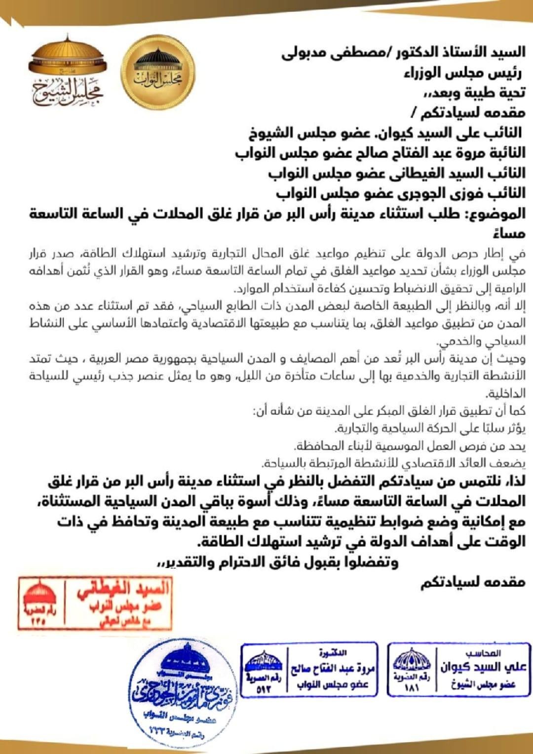 في تحرك برلماني جديد يعكس الاستجابة لمطالب المواطنين ومراعاة خصوصية المدن السياحية، تقدم كل من النائب علي كيوان، والنائبة مروة صالح، والنائب السيد الغيطاني، والنائب فوزي الجوجري، أعضاء مجلس النواب عن محافظة دمياط، بطلب رسمي إلى رئيس مجلس الوزراء، للمطالبة باستثناء مدينة رأس البر من قرار غلق المحال التجارية في تمام الساعة التاسعة مساءً، أسوة بباقي المدن السياحية المستثناة من القرار.
