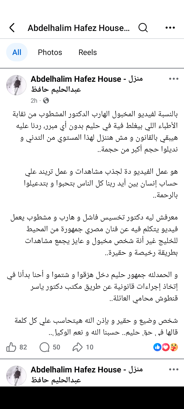 وقالت أسرة عبد الحليم في منشور رصده موقع تحيا مصر على حسابه الرسمي بموقع التواصل الاجتماعي فيسبوك: بالنسبة لفيديو المخبول الهارب الدكتور المشطوب من نقابة الأطباء اللي بيغلط فية في حليم بدون أي مبرر، ردنا عليه هيبقي بالقانون و مش هننزل لهذا المستوي من التدني و نديلوا حجم أكبر من حجمة، هو عمل الفيديو دة لجذب مشاهدات و عمل تريند علي حساب إنسان بين أيد ربنا كل الناس بتحبوا و بتدعيلوا بالرحمة.
