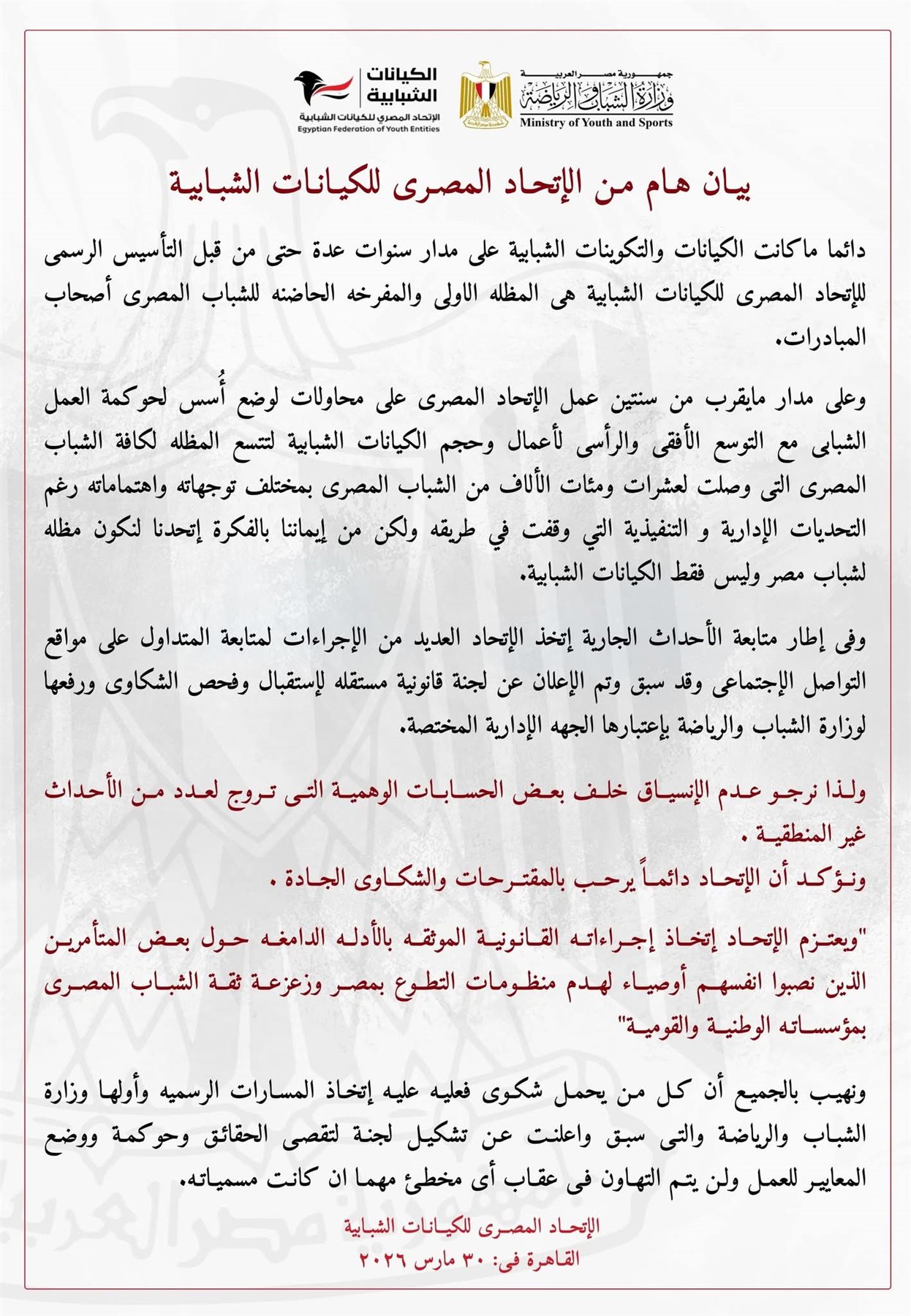 - بيان هام من الاتحاد المصري للكيانات الشبابية
