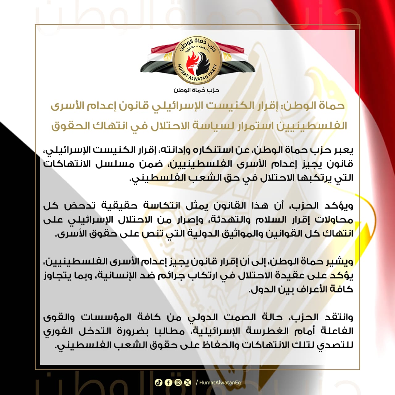 أعرب حزب حماة الوطن عن استنكاره الشديد وإدانته لإقرار الكنيست الإسرائيلي قانونًا يجيز إعدام الأسرى الفلسطينيين، مؤكدًا أن هذا القانون يأتي ضمن مسلسل الانتهاكات المستمرة التي يرتكبها الاحتلال ضد الشعب الفلسطيني.