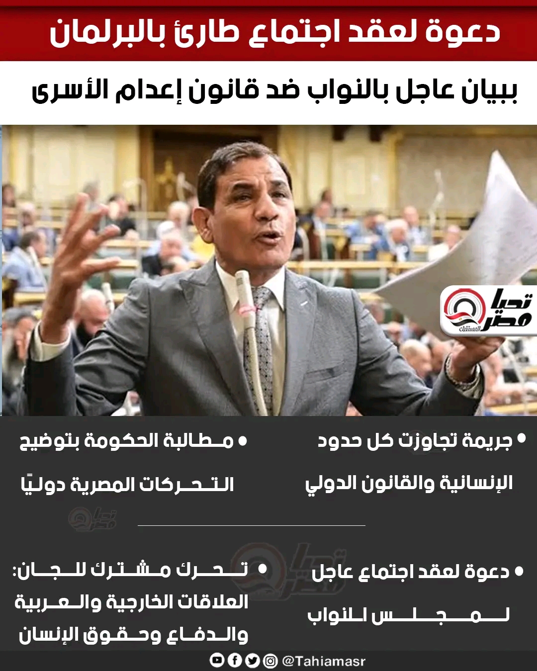 دعوة لعقد اجتماع طارئ بالبرلمان.. بيان عاجل بالنواب ضد قانون إعدام الأسرى