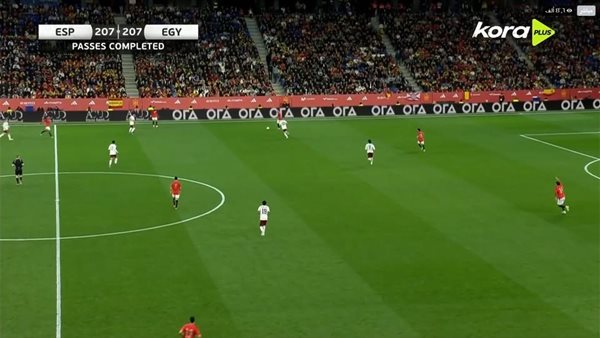 وفي الدقيقة التاسعة والعشرين، كادت العارضة أن تمنع عمر مرموش من تسجيل الهدف الأول لمنتخب مصر، بعد تسديدة قوية من خارج منطقة الجزاء، وهو ما يعكس قوة الهجمات المصرية ونجاعة دفاعات وإصابة حظوظ إسبانيا في الوقت نفسه. واستمر الأداء المصري متوازنًا مع سيطرة واضحة على وسط الملعب، فيما اعتمد الإسبان على الهجمات المرتدة، مع بعض التراجع الدفاعي الواضح خلال الدقائق الأخيرة من الشوط الأول.