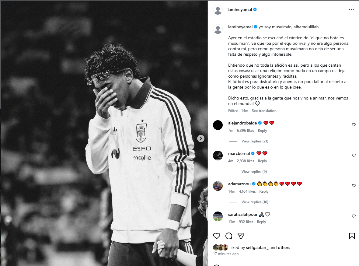 وقال لامين يامال لاعب برشلونة ومنتخب إسبانيا في بيانه: "أنا مسلم، الحمد لله. أمس في الملعب سُمِع هتاف: الذي لا يقفز فهو مسلم. أعلم أن الهتاف كان موجّهًا إلى الفريق المنافس ولم يكن شيئًا شخصيًا ضدي، لكن بصفتي شخصًا مسلمًا، فهذا لا يتوقف عن كونه قلة احترام وأمرًا غير مقبول."