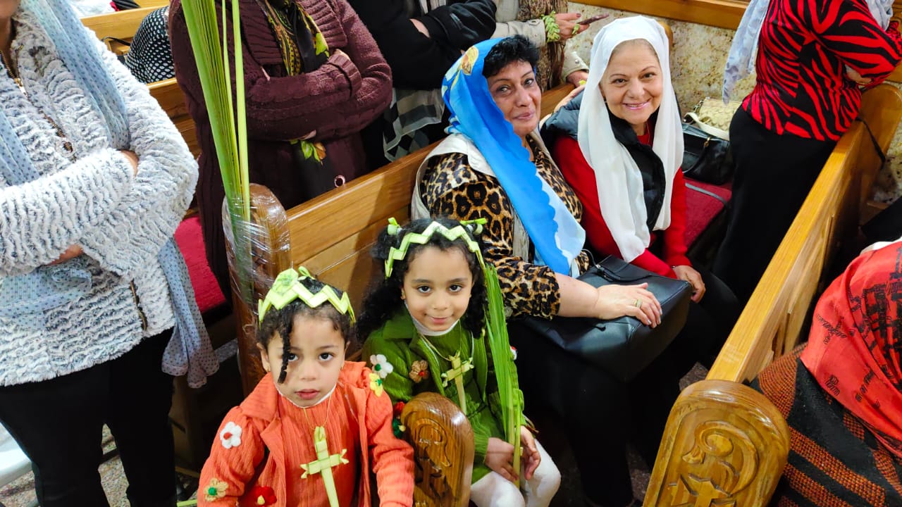 وتجمع الأهالي داخل ساحة الكنيسة، حيث حرصوا على تصوير أبنائهم بتيجان السعف والصلبان، في مشهد من البهجة الروحية.