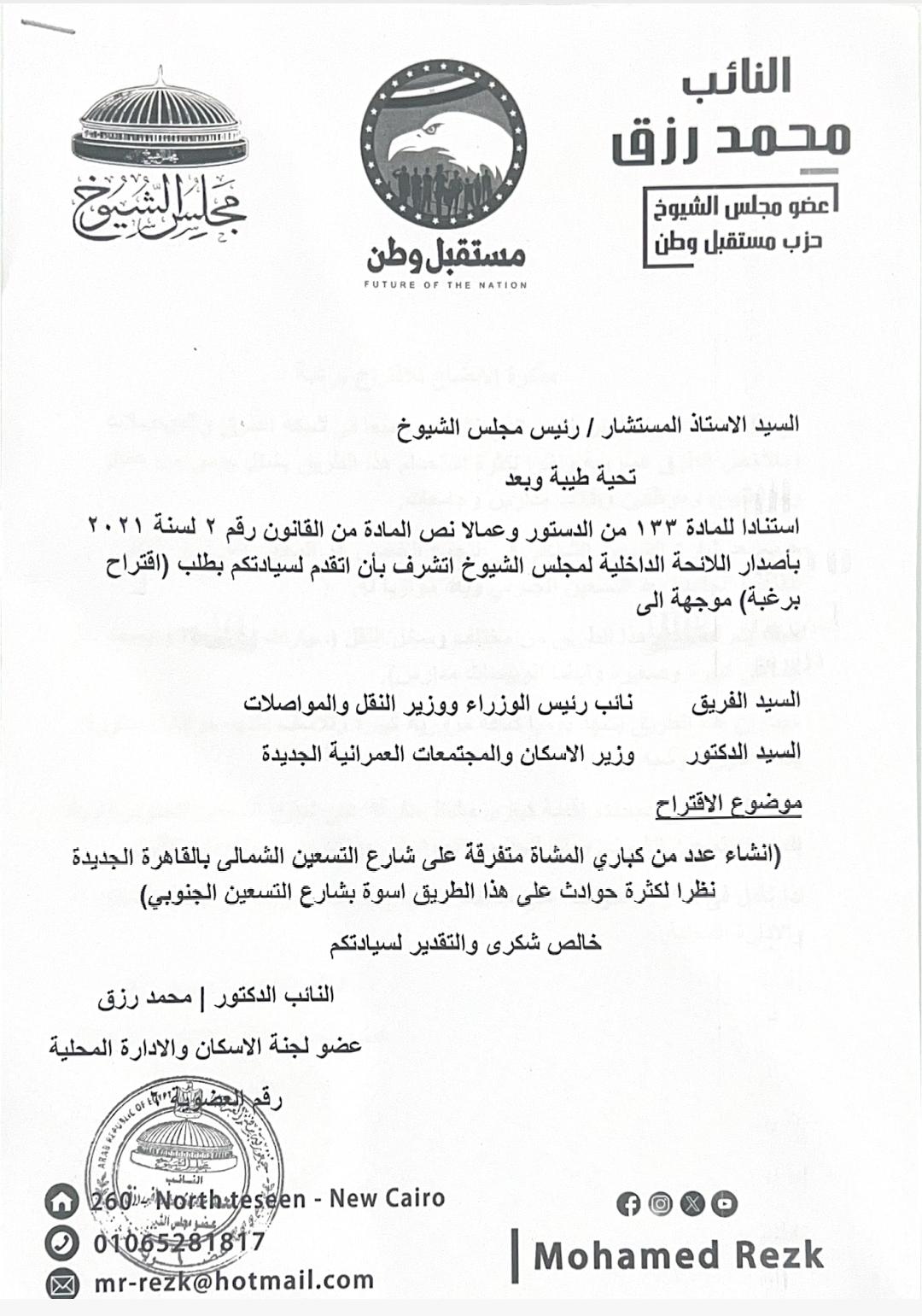 «إسكان الشيوخ» توافق على مقترح النائب محمد رزق لإنشاء كباري مشاة بشارع التسعين الشمالي بالقاهرة الجديدة