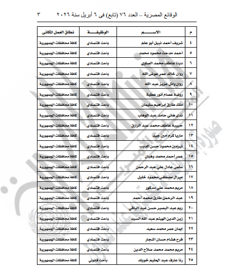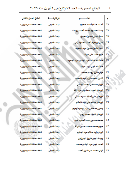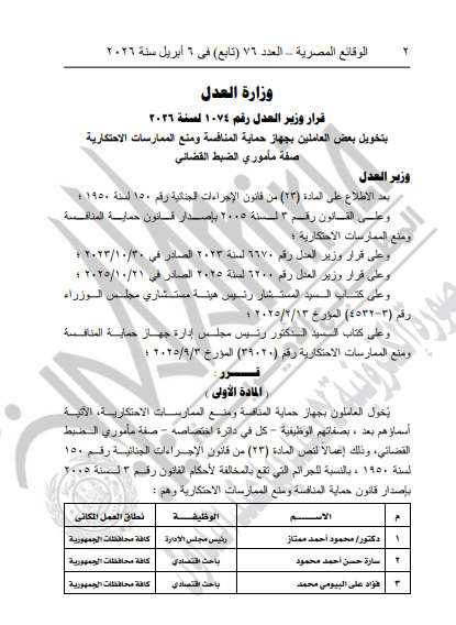 نشرت الجريدة الرسمية في عددها الصادر اليوم الاثنين 6 أبريل 2026، قرار وزير العدل المستشار محمود حلمي الشريف رقم 1074 لسنة 2026، بشأن تخويل عدد من العاملين بجهاز حماية المنافسة ومنع الممارسات الاحتكارية صفة مأموري الضبط القضائي.