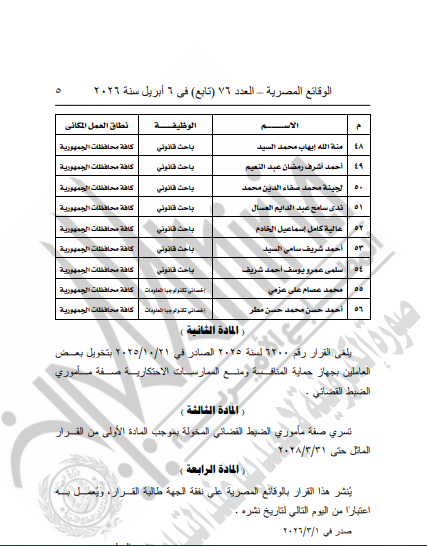 ونص المادة الثانية: يلغى القرار رقم 6200 لسنة2025 الصادر في 2025 /10/21 بتخويل بعض العاملين بجهاز حماية المنافسة ومنع الممارسات الاحتكارية صفة مأموري الضبط القضائي.