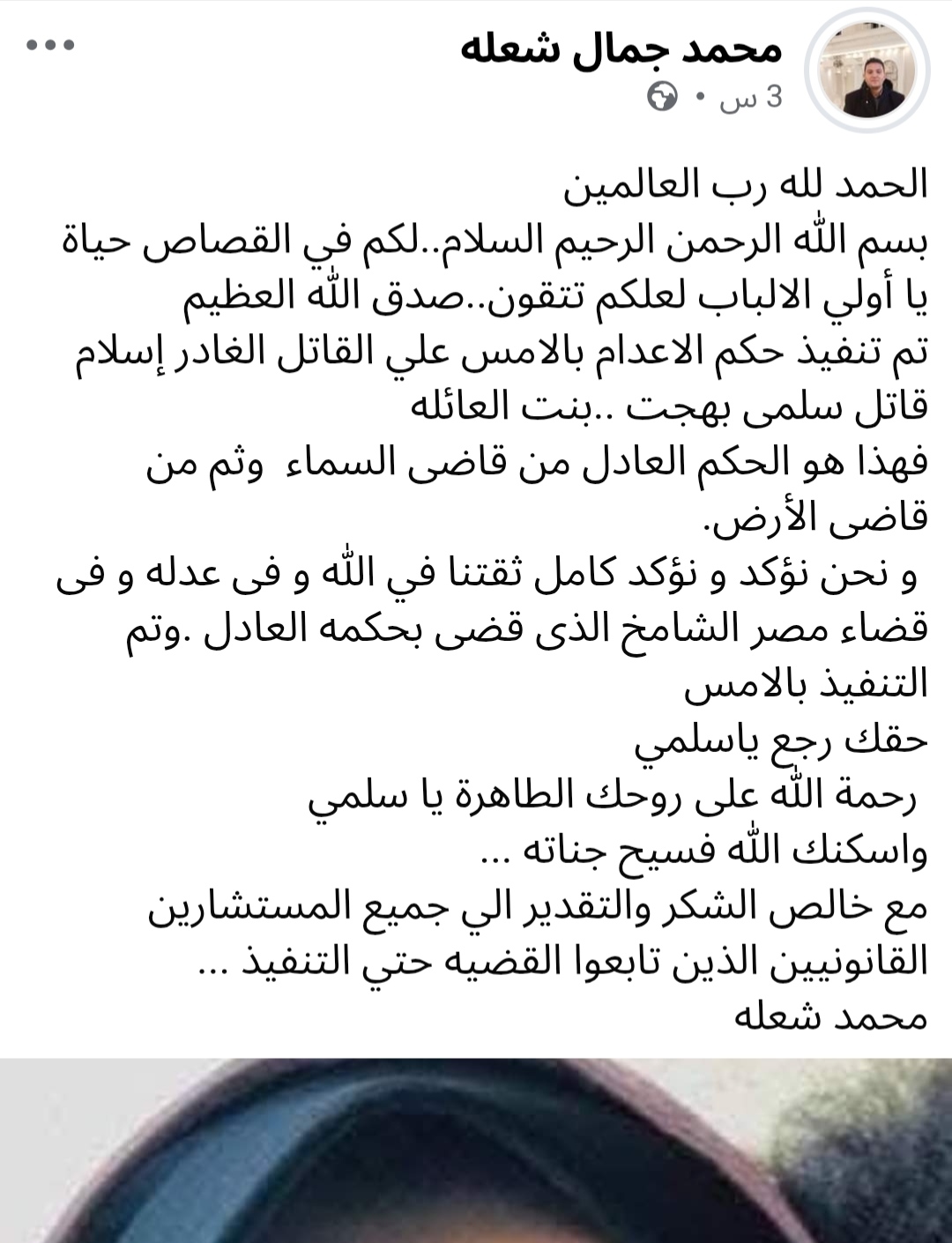 وأضاف الأستاذ محمد في منشوره "هذا هو الحكم العادل من قاضى السماء وثم من قاضى الأرض، و نحن نؤكد و نؤكد كامل ثقتنا في الله و فى عدله و فى قضاء مصر الشامخ الذى قضى بحكمه العادل، وتم التنفيذ بالامس، حقك رجع ياسلمي رحمة الله على روحك الطاهرة يا سلمي واسكنك الله فسيح جناته".