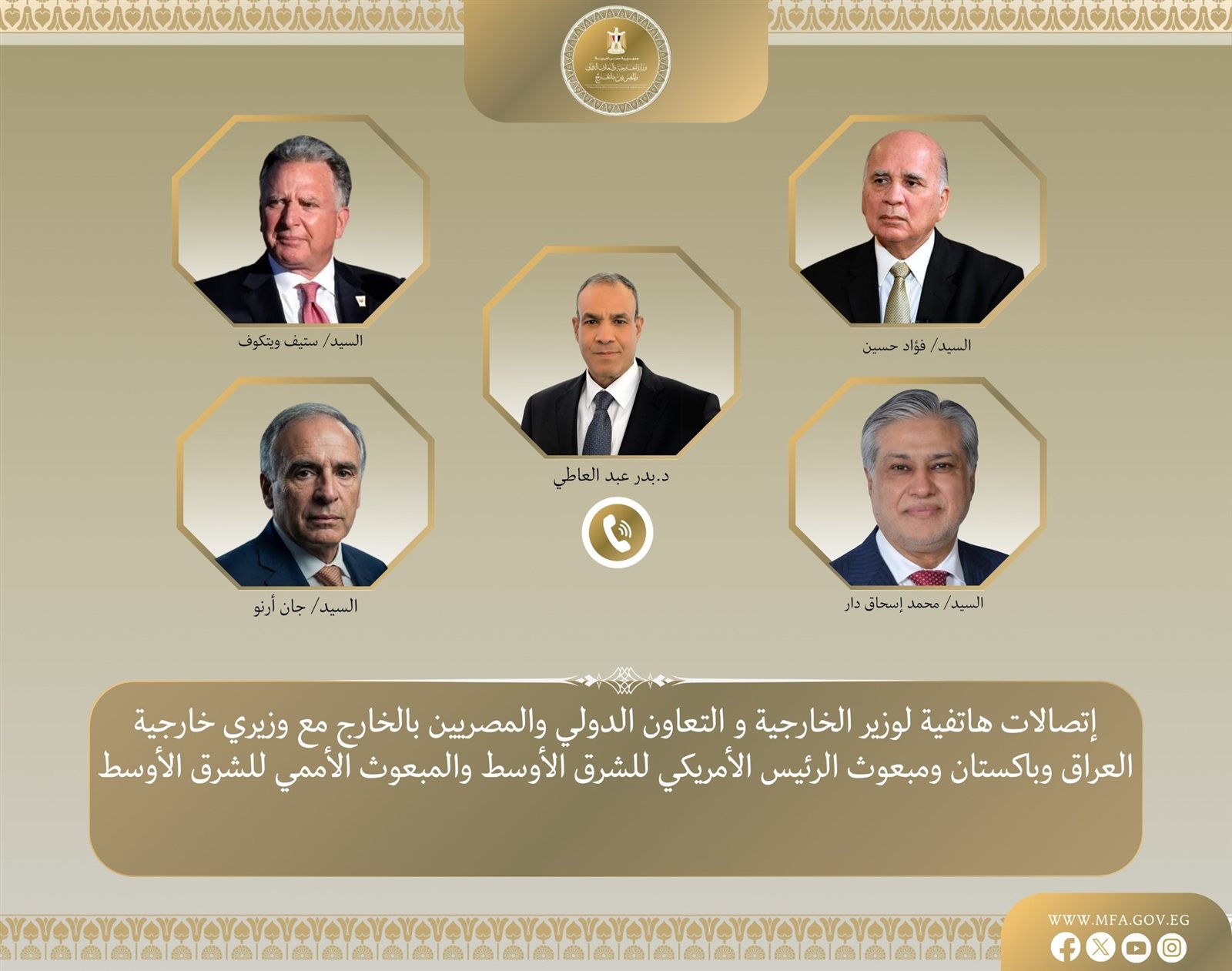 أكد د.بدر عبد العاطي وزير الخارجية والتعاون الدولى والمصريين بالخارج على ضرورة تغليب الحكمة لتجنب سيناريو كارثى لن يكون أى طرف بمنأى عن تداعياته، وجاء ذلك خلال اتصالاته المكثفة حيث جرت اتصالات بين وزير الخارجية مع د. فؤاد حسين نائب رئيس مجلس الوزراء وزير خارجية جمهورية العراق، ومحمد إسحاق دار نائب رئيس الوزراء ووزير خارجية باكستان، وستيف ويتكوف المبعوث الأمريكي الخاص للشرق الأوسط، وجان أرنو المبعوث الشخصي للسكرتير العام للأمم المتحدة للشرق الأوسط، وذلك فى إطار جهود خفض التصعيد واحتواء الموقف العسكرى المتصاعد بالمنطقة.