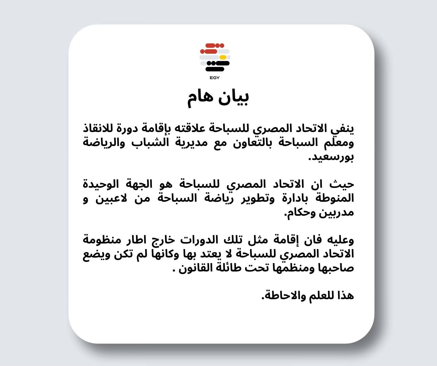 وينفي الاتحاد المصري للسباحة بشكل قاطع علاقته بإقامة دورة للإنقاذ ومعلم السباحة بالتعاون مع مديرية الشباب والرياضة بمحافظة بورسعيد، مؤكدًا أن هذه الدورات لا تمت له بصلة.