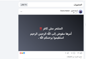 جاء ذلك عبر منشور على صفحته الشخصية "فيسبوك"، وجاء نصه " المنتحر مش كافر ، أمرها مفوض إلى الله الرحمن الرحيم، استقيموا يرحمكم الله" .