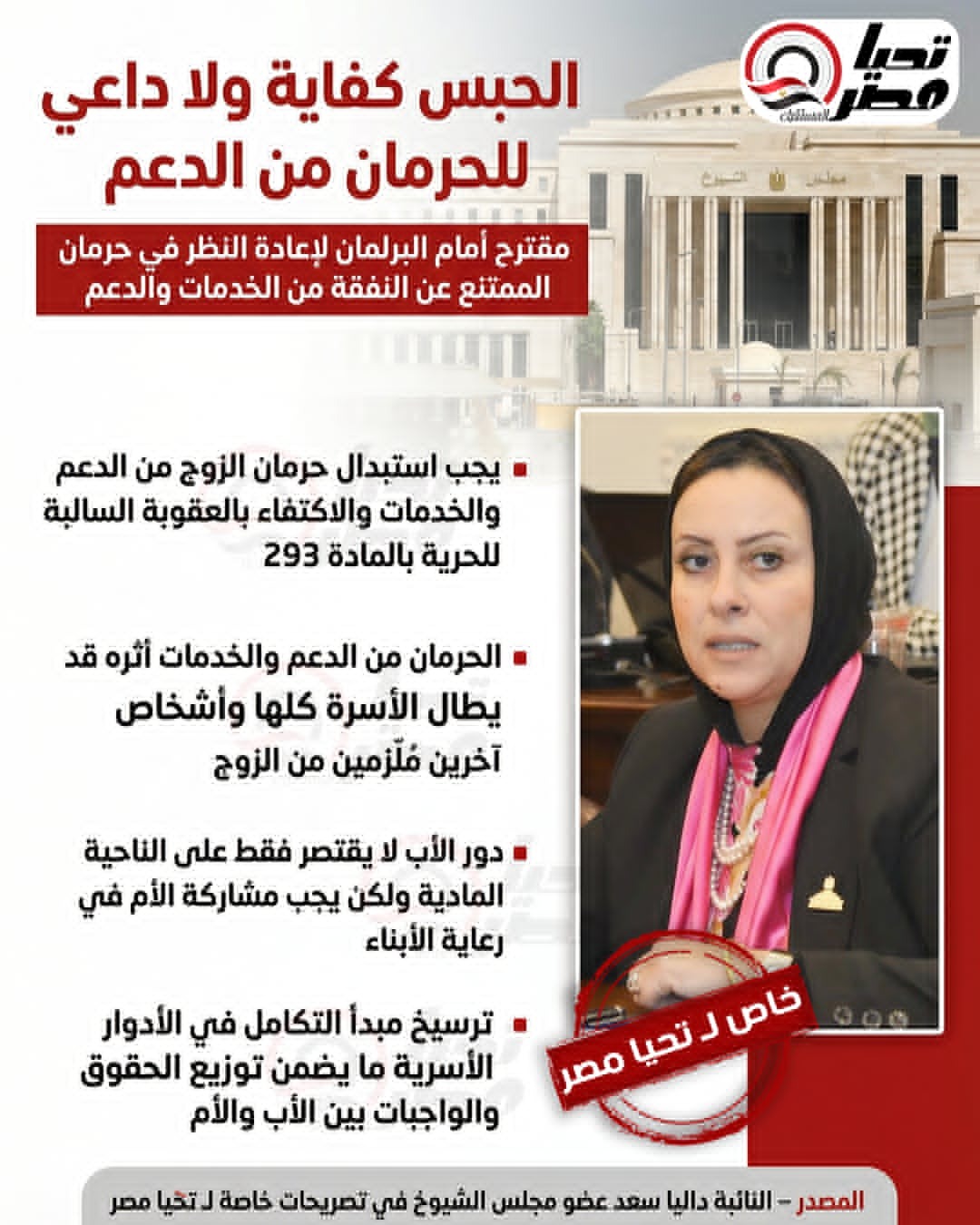 طالبت النائبة داليا سعد، عضو مجلس الشيوخ، بإعادة النظر في بعض أحكام قانون العقوبات المتعلقة بجرائم الامتناع عن سداد النفقة، داعية إلى إلغاء عقوبة حرمان الزوج من الخدمات والدعم الحكومي، والاكتفاء بالعقوبة السالبة للحرية المنصوص عليها في المادة 293.