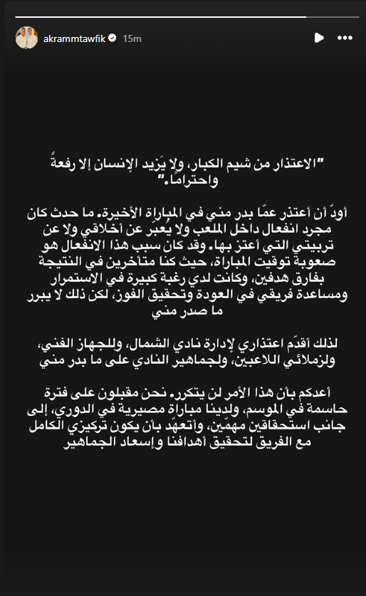 تحيا مصر، وجاء تحرك أكرم توفيق سريعًا لاحتواء الموقف، حيث نشر رسالة اعتذار رسمية عبر حسابه على موقع "إنستجرام"، مؤكدًا التزامه بالقيم الرياضية واحترامه لجميع الأطراف داخل النادي.