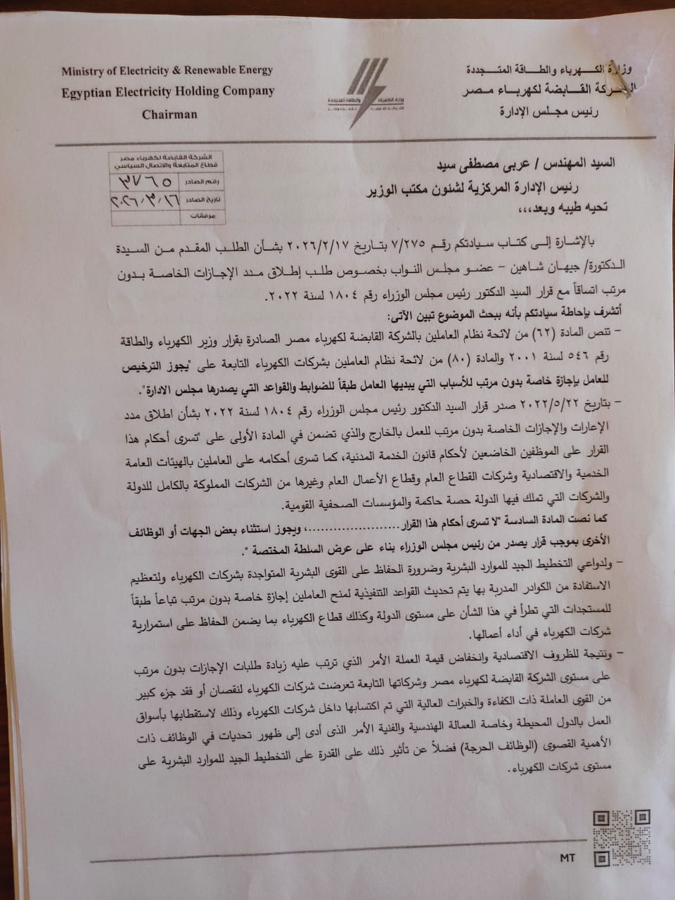 استجابة سريعة لطلب النائبة د. جيهان شاهين… حل أزمة العاملين بشركات الكهرباء بشأن الإجازات الخاصة بدون أجر