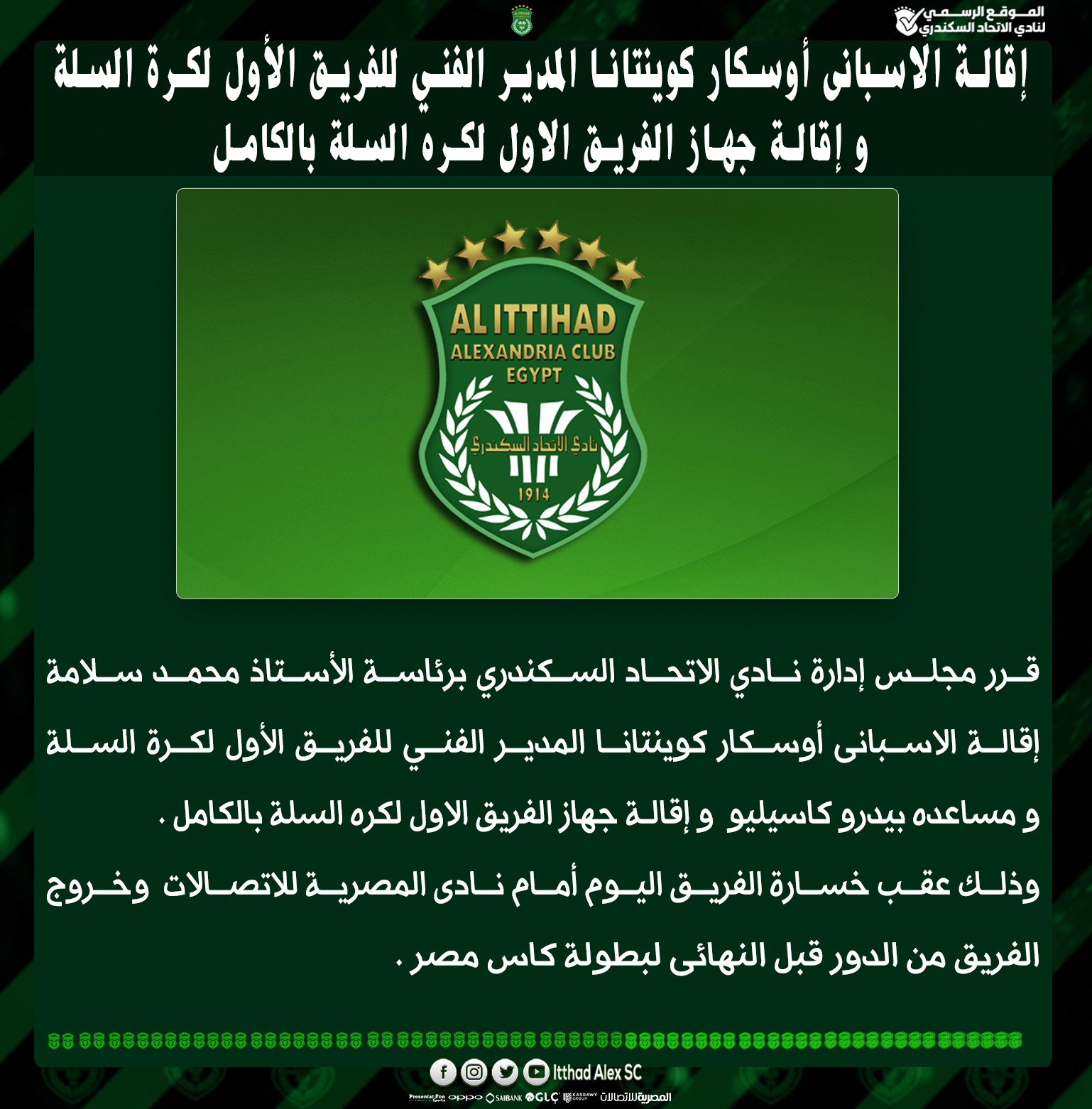 قرر مجلس إدارة نادي الاتحاد السكندري برئاسة محمد سلامة إقالة الإسباني أوسكار كوينتانا المدير الفني للفريق الأول لكرة السلة ومساعده بيدرو كاسيليو وإقالة جهاز الفريق الأول لكرة السلة بالكامل، ويستعرض تحيا مصر التفاصيل.