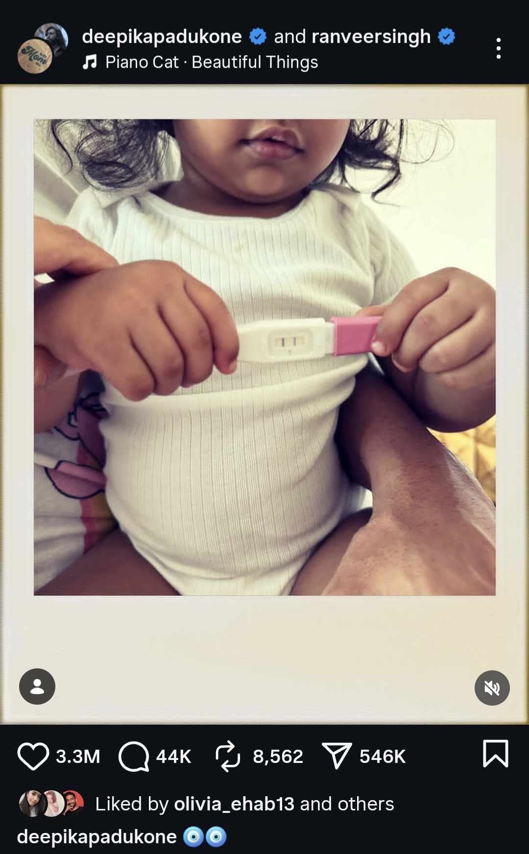 وجاء إعلان ديبيكا عبر منشور رصده موقع تحيا مصر حمل طابعًا بسيطًا ومعبّرًا، ظهرت فيه وهي تضع خرزة زرقاء، في إشارة رمزية اعتاد البعض استخدامها في الثقافة الهندية باعتبارها رمزًا للحماية وجلب الطاقة الإيجابية والطمأنينة خلال فترات الحمل، ولم تتضمن الرسالة تفاصيل إضافية، لكنها لاقت تفاعلًا واسعًا من جمهورها حول العالم.