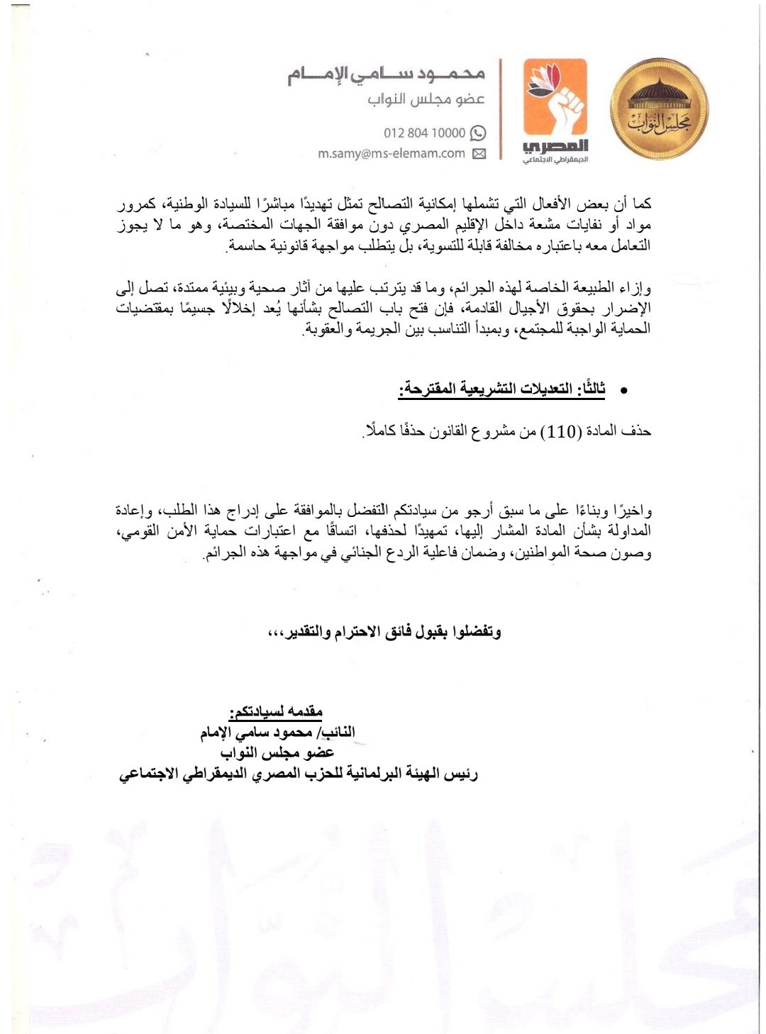 واقترح إجراء تعديلات تشريعية تشمل حذف المادة (110) من مشروع القانون حذفا كاملا، واختتم مطالبا بالموافقة على إدراج هذا الطلب، وإعادة المداولة بشأن المادة المشار إليها، تمهيدًا لحذفها، اتساقًا مع اعتبارات حماية الأمن القومي، وصون صحة المواطنين، وضمان فاعلية الردع الجنائي في مواجهة هذه الجرائم.