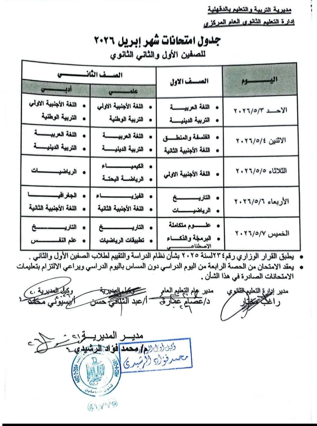 - جدول امتحان تانية ثانوي الدقهلية أبريل