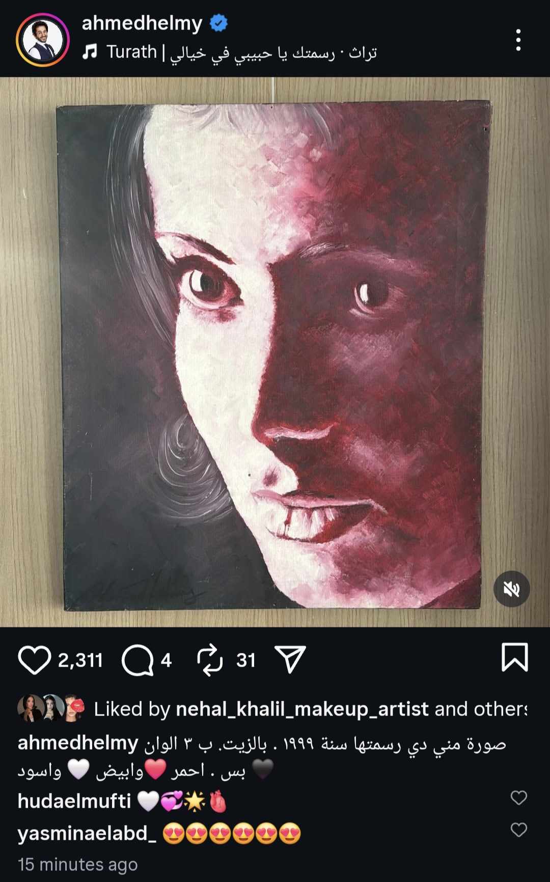 وعلّق على الصورة قائلًا: “صورة منى دي رسمتها سنة 1999 بالزيت بـ3 ألوان بس.. أحمر وأبيض وأسود”، وهو ما أثار تفاعلًا واسعًا من الجمهور الذي أشاد بموهبته وبالطابع الرومانسي الذي تحمله اللوحة.