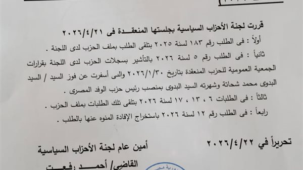 كما قررت اللجنة في الطلبات أرقام 5 و6 و13 و17 لسنة 2026 تلقي الطلبات وإضافتها إلى ملف الحزب، بالإضافة إلى الطلب رقم 12 لسنة 2026 بشأن استخراج الإفادة المطلوبة.
