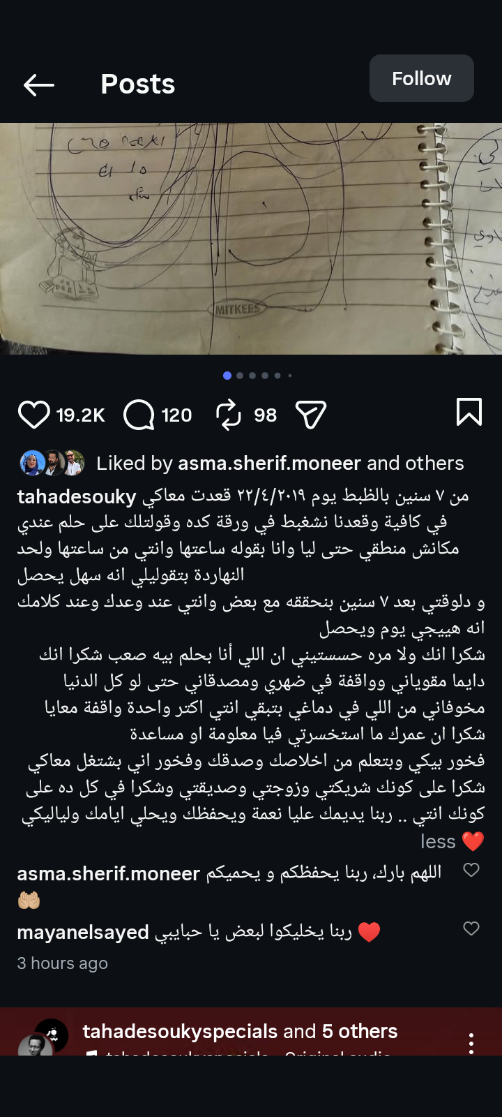 وقال طه دسوقي في منشور رصده موقع تحيا مصر على حسابه الرسمي بموقع تبادل الصور والفيديوهات انستجرام: "من ٧ سنين بالظبط يوم ٢٢/٤/٢٠١٩ قعدت معاكي في كافيه وقعدنا نشخبط في ورقة كده وقولتلك على حلم عندي مكانش منطقي حتى ليا وانا بقوله ساعتها وانتي من ساعتها ولحد النهاردة بتقوليلي انه سهل يحصل، و دلوقتي بعد ٧ سنين بنحققه مع بعض وانتي عند وعدك وعند كلامك انه هييجي يوم ويحصل.