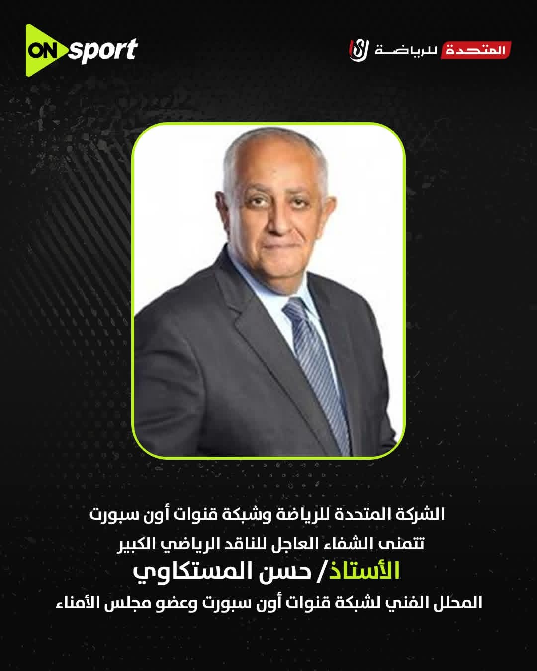 وكانت نشرت شبكة قنوات أون سبورت والشركة المتحدة للرياضة عبر صفحاتهما الرسمية على موقع فيسبوك رسالة دعم، أعربتا خلالها عن خالص تمنياتهما بالشفاء العاجل للناقد الرياضي الكبير الأستاذ حسن المستكاوي، المحلل الفني لشبكة قنوات أون سبورت وعضو مجلس الأمناء.