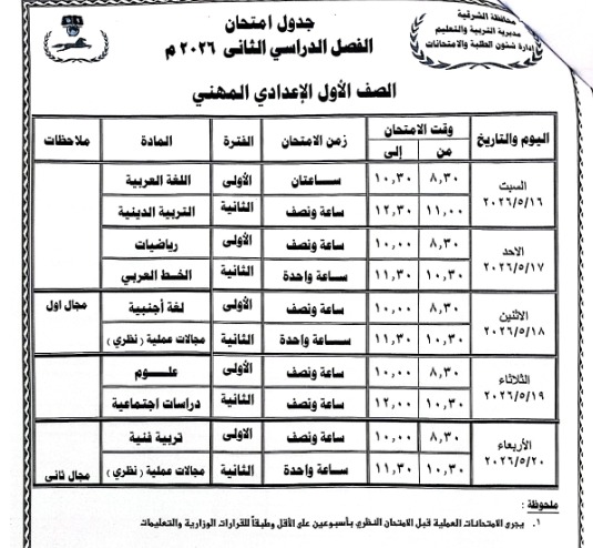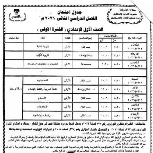 ▪️تعقد امتحانات الصفوف الاول والثاني الاعدادي عام علي مدار ٨ أيام تبدأ يوم الثلاثاء ١٢-٥-٢٠٢٦ وتنتهي يوم الأربعاء ٢٠-٥-٢٠٢٦.
