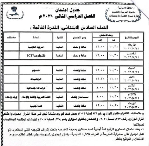 ▪️تعقد امتحانات الصفوف الرابع والخامس والسادس الابتدائي علي مدار ٧ أيام تبدأ يوم الأربعاء ١٣-٥-٢٠٢٦ وتنتهي يوم الأربعاء ٢٠-٥-٢٠٢٦.