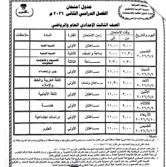 ▪️تعقد امتحانات الصف الثالث الاعدادي العام على مدار ٧ أيام تبدأ يوم الخميس ٤-٦-٢٠٢٦ وتنتهي يوم الخميس ١١-٦-٢٠٢٦.