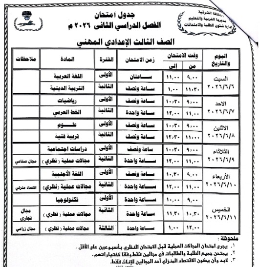 ▪️تعقد امتحانات الصف الثالث الاعدادي ( المهني - النور - الامل ) على مدار ٦ أيام تبدأ يوم السبت ٦-٦-٢٠٢٦ وتنتهي يوم الخميس ١١-٦-٢٠٢٦.