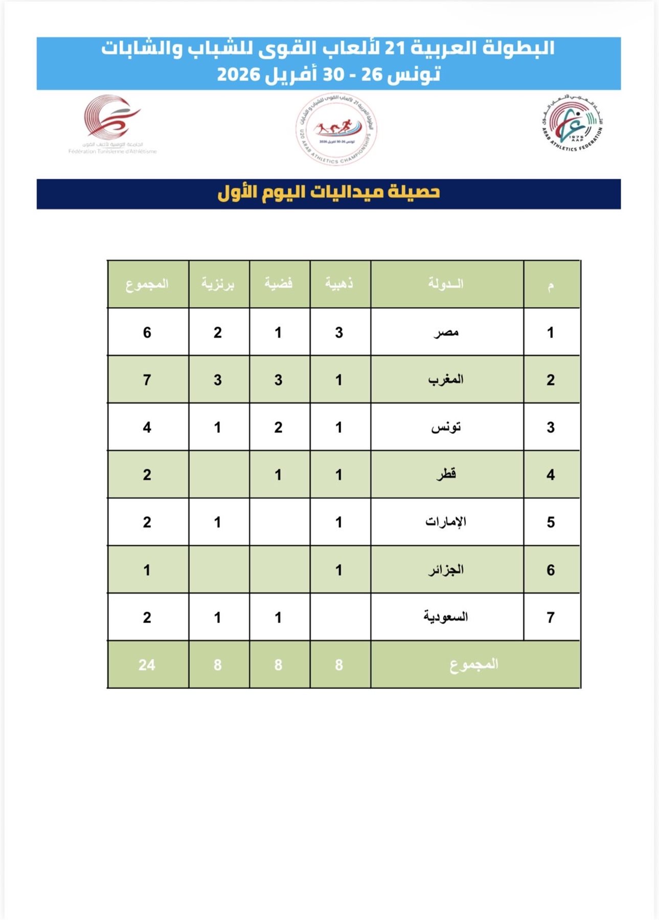 وبفضل هذه النتائج، تصدر منتخب مصر لألعاب القوى جدول ترتيب البطولة برصيد 6 ميداليات، متفوقا على المغرب التي جاءت في المركز الثاني برصيد 7 ميداليات منها ذهبية واحدة، فيما حلت تونس في المركز الثالث برصيد 4 ميداليات.