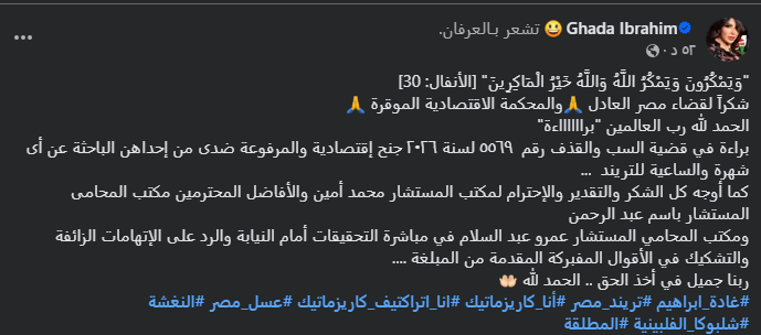 قضت المحكمة الاقتصادية ببراءة الفنانة غادة إبراهيم من تهمة سب وقذف الإعلامية بوسي شلبي في القضية التي حملت رقم 5569 لسنة 2026 جنح اقتصادية.