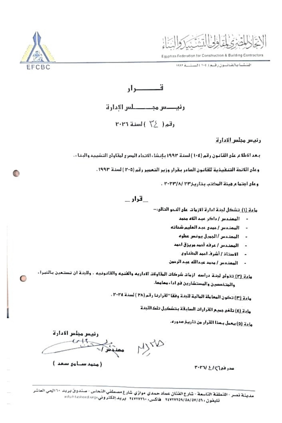 أصدر المهندس محمد سامي سعد، رئيس مجلس إدارة الاتحاد المصري لمقاولي التشييد والبناء، القرار رقم (34) لسنة 2036 بشأن تشكيل لجنة متخصصة لإدارة الأزمات التي تواجه شركات المقاولات، وذلك في إطار تعزيز قدرة القطاع على التعامل مع التحديات الإدارية والفنية والقانونية.