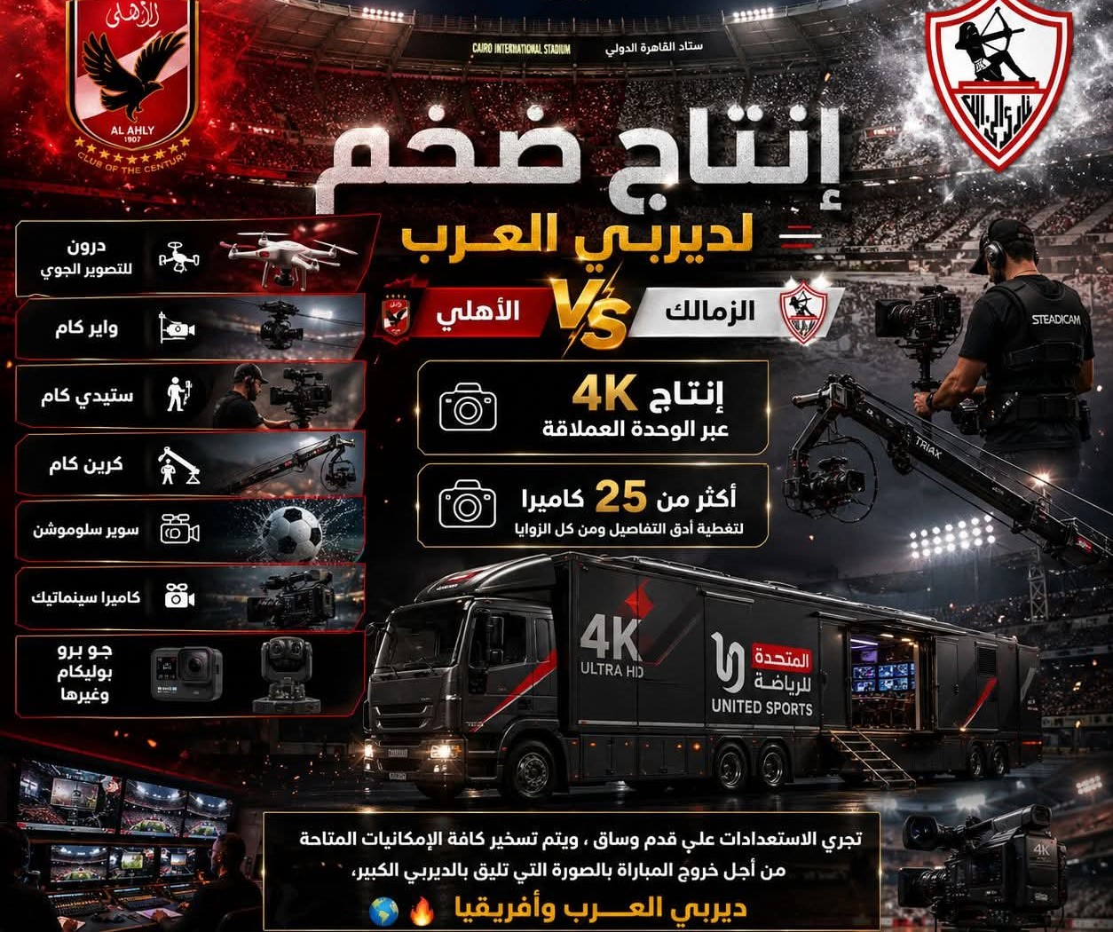 هذا التنوع الكبير في معدات إنتاج مباراة الأهلي والزمالك يضمن تغطية كافة زوايا الملعب، وتقديم لقطات مميزة تعكس تفاصيل المباراة بدقة عالية.