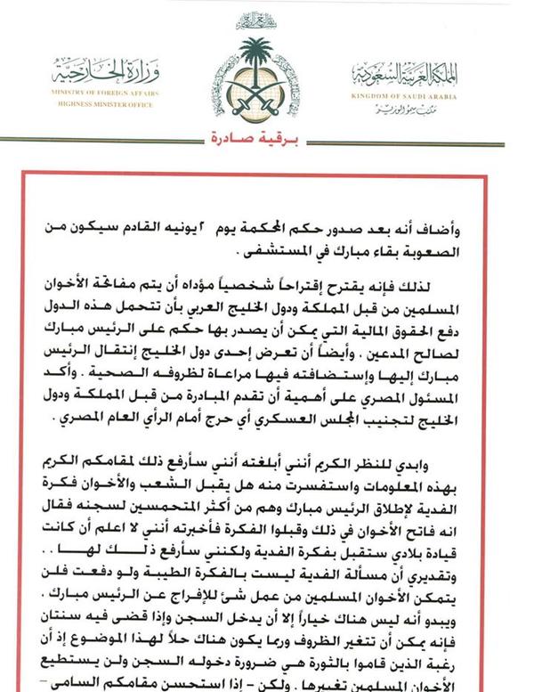 كشفت تسريبات "ويكليكس" الأخيرة عن فضيحة لجماعة الإخوان المسلمين أثناء فترة حكمهم لمصر، بعد تداول أوراق تثبت أن المهندس "خيرت الشاطر القيادي" بجماعة الإخوان الإرهابية، وافق علي الإفراج عن الرئيس الأسبق "محمد حسني مبارك" مقابل فدية من دول الخليج تبلغ 10 مليارت دولار، وإسقاط جميع التهم الموجهة ضد الرئيس الأسبق.