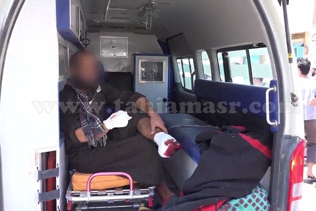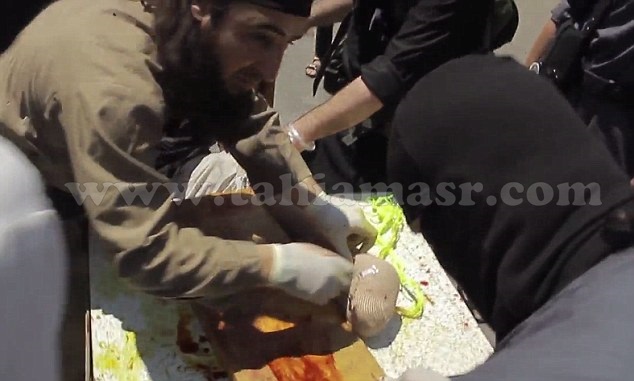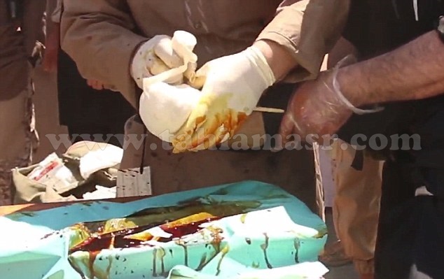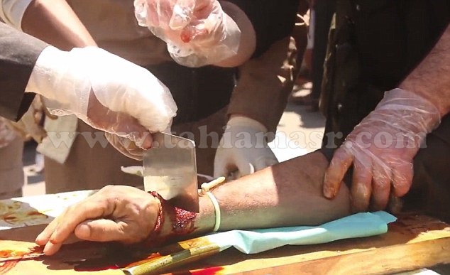 يظهر فى الصور شخصين، يقوم التنظيم ببتر اطرافهم بحجة تطبيق حد السرقة عليهم بأستخدام الـ "ساطور".