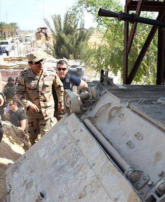 حرص الرئيس عبد الفتاح السيسي علي تحية الجنود في أماكن خدمتهم في شمال سيناء، والتقطت عدسات الكاميرا صورة للرئيس "السيسي" وهو يسلم علي جندي متمركز فوق الدبابة لتأدية خدمتة وحماية الوطن.