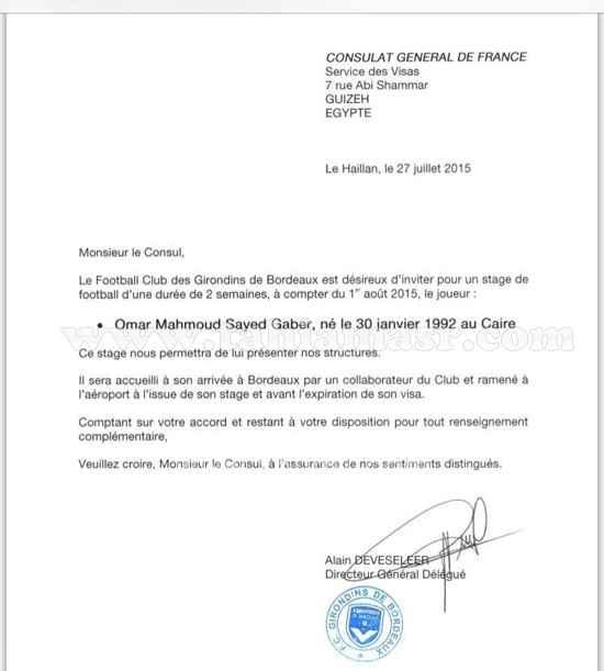 وكان عمر جابر قد خاص فترة معايشة لمدة 4 أيام مع نادي بوردو.