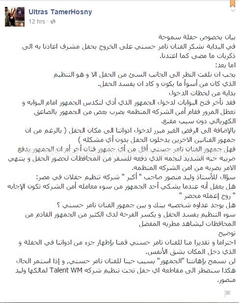 أصدر أولتراس "تامر حسنى" أمس بيان عبر الصفحة الرسمية للأولتراس على موقع التواصل الإجتماعى "فيس بوك" تضمن هجوماً على وليد منصور بسبب سوء التنظيم للحفل بالإضافة إلى إعتداء الأمن على الجمهور بالصواعق الكهربائية بسبب التكدس والزحام الشديد وجاء نص البيان كالتالى "بيان بخصوص حفلة سموحة، في البداية نشكر الفنان تامر حسني على الخروج بحفل مشرف اعادنا به الى ذكريات ما مضى كما اعتدنا.