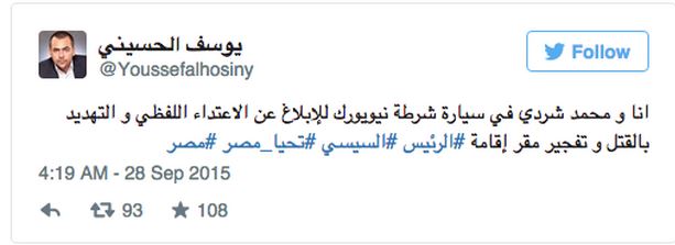 فجر الإعلامي يوسف الحسيني مفاجأة في أول تعليق لها بعد الإعتداء عليه من قبل انصار جماعة الإخوان الإرهابية في ولاية نيويورك بأمريكا، وذلك عبر حسابة الشخصي علي موقع التواصل الاجتماعي "تويتر"، وقال أنه يتواجد حاليا هو والإعلامي مصطفي شردي في سيارة الشرطة لتقديم بلاغ بالاعتداء والتهديد بالقتل وتفجير مقر إقامة الرئيس عبد الفتاح السيسي من قبل جماعة الإخوان الارهابية، علي حد زعمه.