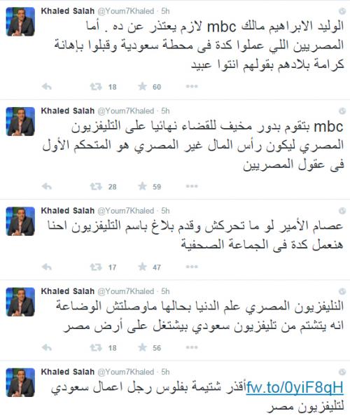 انتقد الإعلامى خالد صلاح، رئيس تحرير جريدة اليوم السابع، على حسابه على موقع التواصل الاجتماعى تويتر، الهجوم غير المبرر على التليفزيون المصرى والذى شنته قناة mbc، مؤكدا أننا فوجئنا مؤخرا بأقذر شتيمة لتليفزيون مصر بتمويل من رجل أعمال سعودى كما طالب القناة بتقديم الإعتذار.
