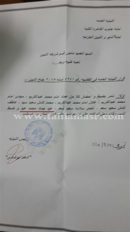 جاءت مذكرة النيابة بتاريخ 2 نوفمبر 2015، لكن لم يتم القبض إلي الآن علي المتهم رغم أن مكانه معلوم، ومتواجد في مقر حملته الانتخابية بمدينة 15 مايو، وتقاعس العقيد طارق البدوي ، مأمور قسم التبين، عن ضبط المتهم، رغم إرسال النيابة مذكرة الضبط له.