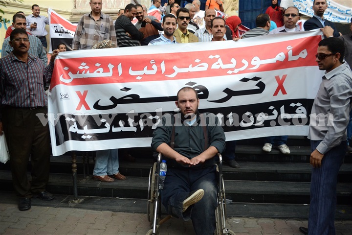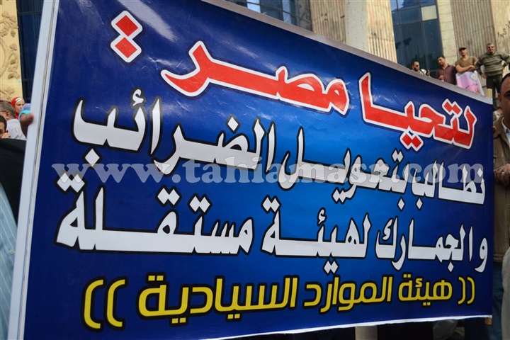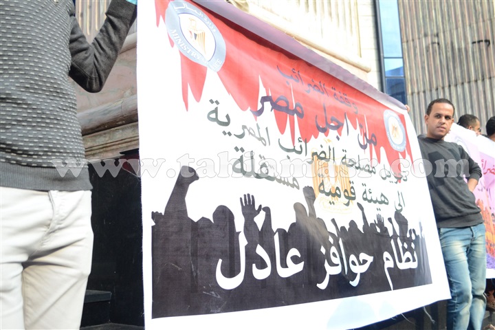 بالفيديو والصور.. مظاهرة لموظفي الضرائب احتجاجا علي تطبيق قانون الخدمة العامة