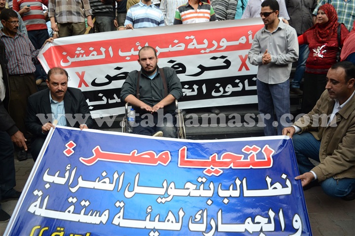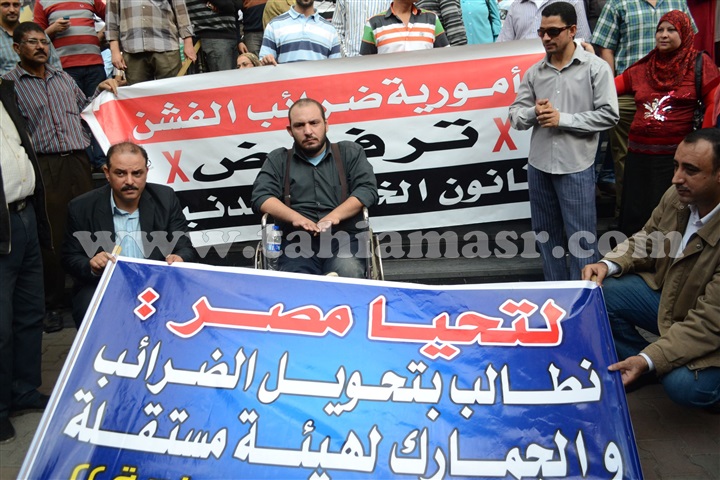 تظاهر اليوم السبت عدد من موظفي مصلحة الضرائب، أمام نقابة الصحفيين، للمطالبة بإقالة وزير المالية على خلفية تطبيق قانون الخدمة العامة.