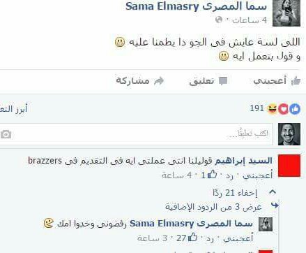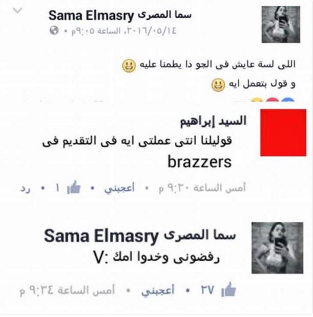 أحرجت الراقصة سما المصري أحد متابعيها علي موقع التواصل الاجتماعي "فيس بوك" بعد سؤاله عن نتيجة تقديمها للتمثيل في أحد أكبر مواقع إنتاج الأفلام الإباحية، فقالت له "رفضوني وخدوا أمك".