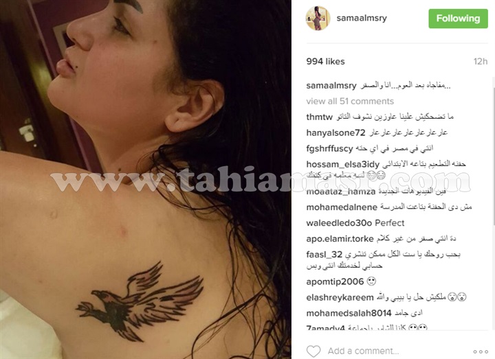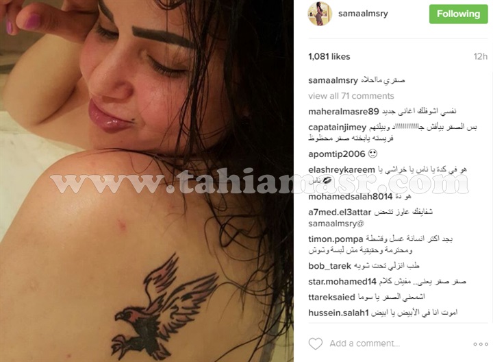 إستعرضت الراقصة سما المصرى، وشمها الجديد حيث قامت بنشر صور عارية لها عبر حسابها الخاص على موقع الصور "انستجرام" أظهرت الوشم على الكتف وهو عبارة عن صقر.